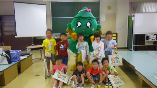 すぎぴょんから図書館バッグを受け取りみんなうれしそうです。