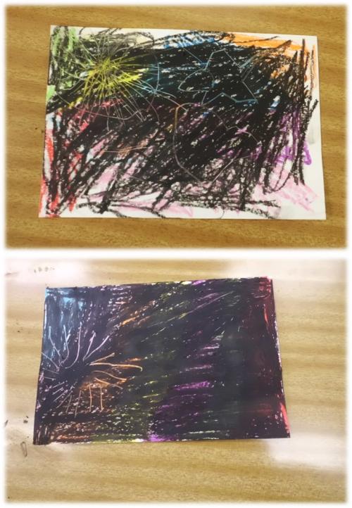 「スクラッチ」と呼ばれる技法で、画用紙に下地としてカラフルな色をクレヨンで塗り、黒色クレヨンを上塗りして、粘土べらでひっかき傷を作り下地を出しデザインを作っていくという学習となります。