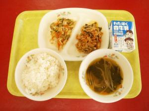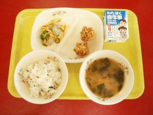 今日は、「じゃがいも」についてお話しします。じゃがいもは初夏と秋に旬をむかえます。じゃがいもは植物のくきがふくらんだものです。炭水化物が多く含まれており、皆さんの体や頭を動かすエネルギー源になります。今日の給食では、生揚げと一緒にみそ汁の具にしました。食感の違いを楽しみながら食べてみてください。