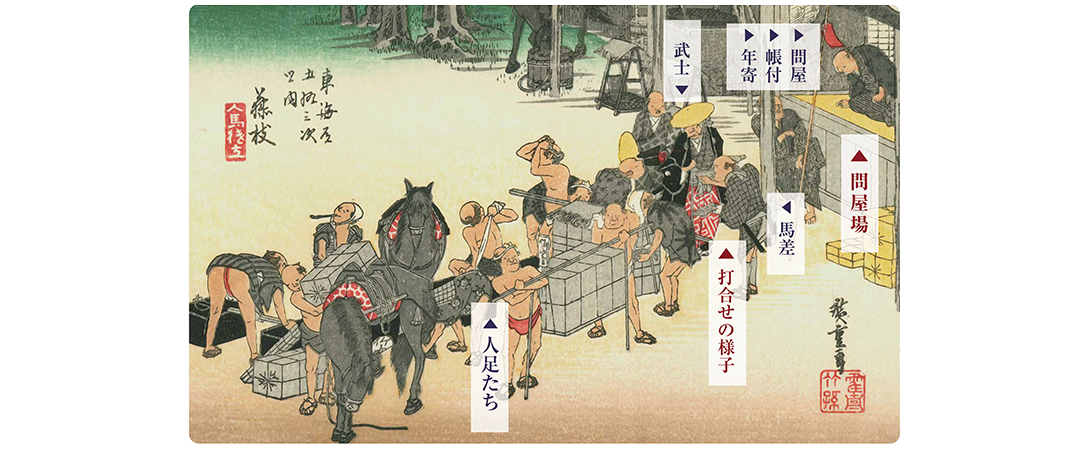 主な役職として、問屋(人馬を取り仕切る監督職)と年寄(問屋を補佐する役職)、張付(出納や事柄を帳面に書き付ける役職)、馬差(馬の用立てや運輸の指図する役職)などが詰めていました。